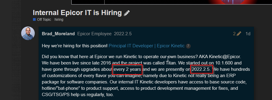 I think we all want the same things - fewer bugs, more stability, less disruption, oh and yes new features too. We just disagree on the approach to get there. On the one hand you have the eternal optimists (Mark) who want Epicor to get on board with a true dev ops/cicd/feature flagging mindset where we can ABU (“always be upgrading”) with minimal disruption. On the other hand you have the eternal pessimists (me) who do not believe Epicor will ever be able achieve this level in the development organization, accept that the upgrades will always be painful, and prefer to minimize the disruption by just doing fewer of them.