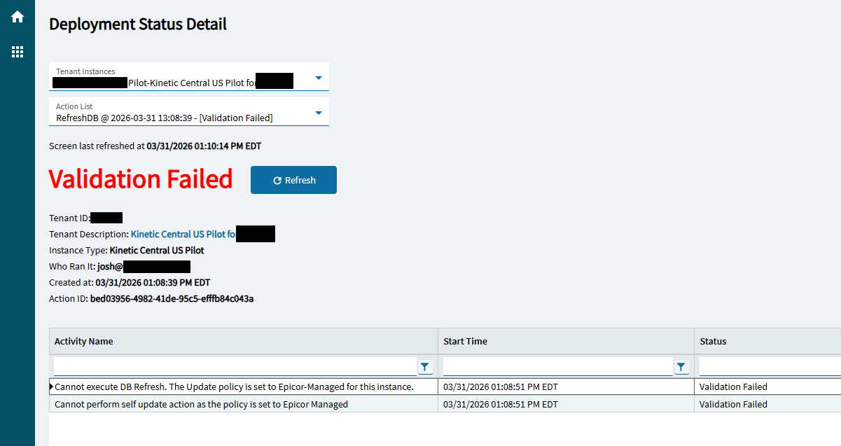 I ran into the same thing. I changed the options to Self-Managed, which allowed me to get past the first step where it was failing validation. But, it still errored out. I ended up having to put a ticket into Tech Support for them to do the refresh. I followed up on the ticket to see if I am supposed to be able to do this on my own (they said I was). I’ve probably done 7-8 refreshes of various environments over the last 6 months using CMP, I end up having to get Tech Support to run it more often than not.