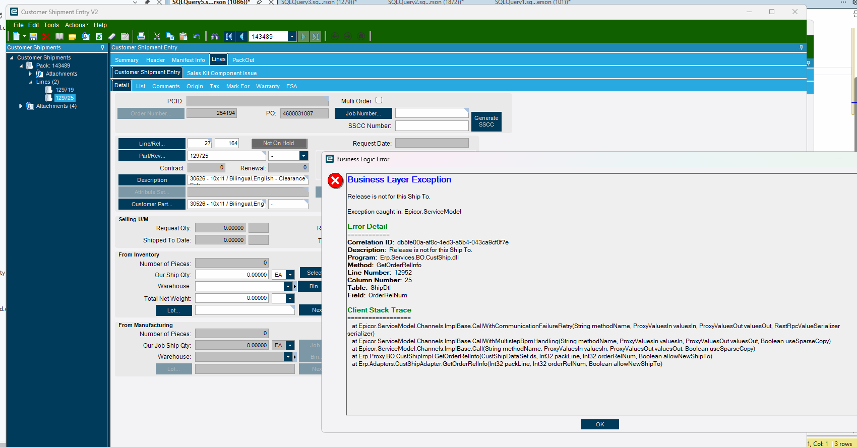 To recreate, header has a ship to number of something, so not blank. Then use OTS on the multiple line. Then try to ship the lines on the same pack slip. See if you get the error.