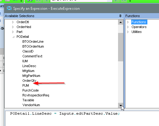 The configurator can’t even set the PartNum on the PODetail. Note there’s no access to the PODetail.Partnum