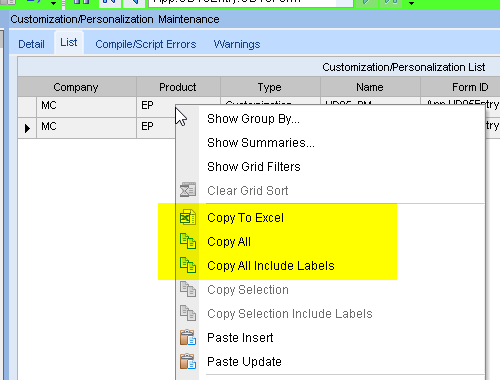 So continuing on the testing/upgrading process. from 10.1.600 to 10.2.400. I’ve just tried to do a copy to of the list of customizations to excel. Thinking it was a the O’le Copy to excel bug raising its head, but I can copy to excel from any other dashboard, or search results.