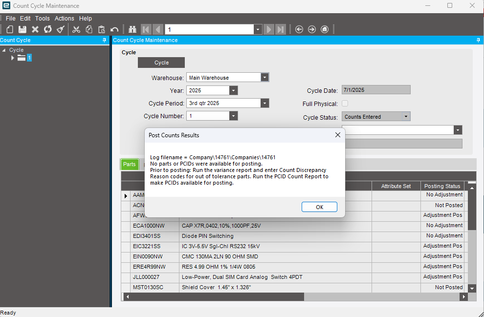 When attempting to post a cycle or physical count a Post Count Results message appears that states “No parts or PCIDs were available for posting.