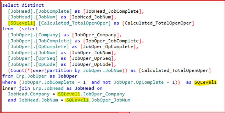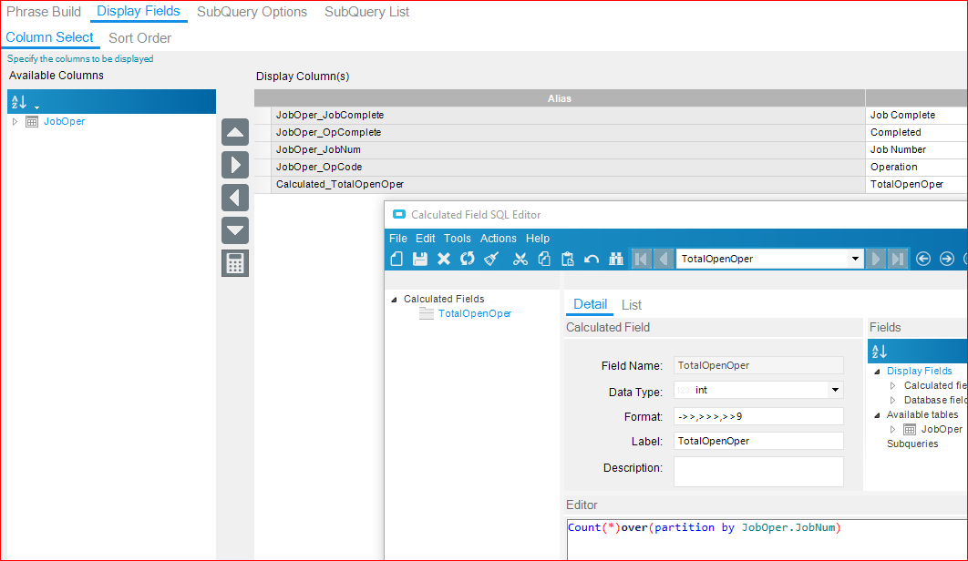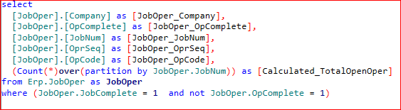 I’m writing a BAQ that reports the number of Operations that have NOT been completed on a job. I’ve tried this several different ways but this is the last formula I came up with: "When JobOper.OpComplete = ‘FALSE’ then count( JobOper.OpComplete) else end"