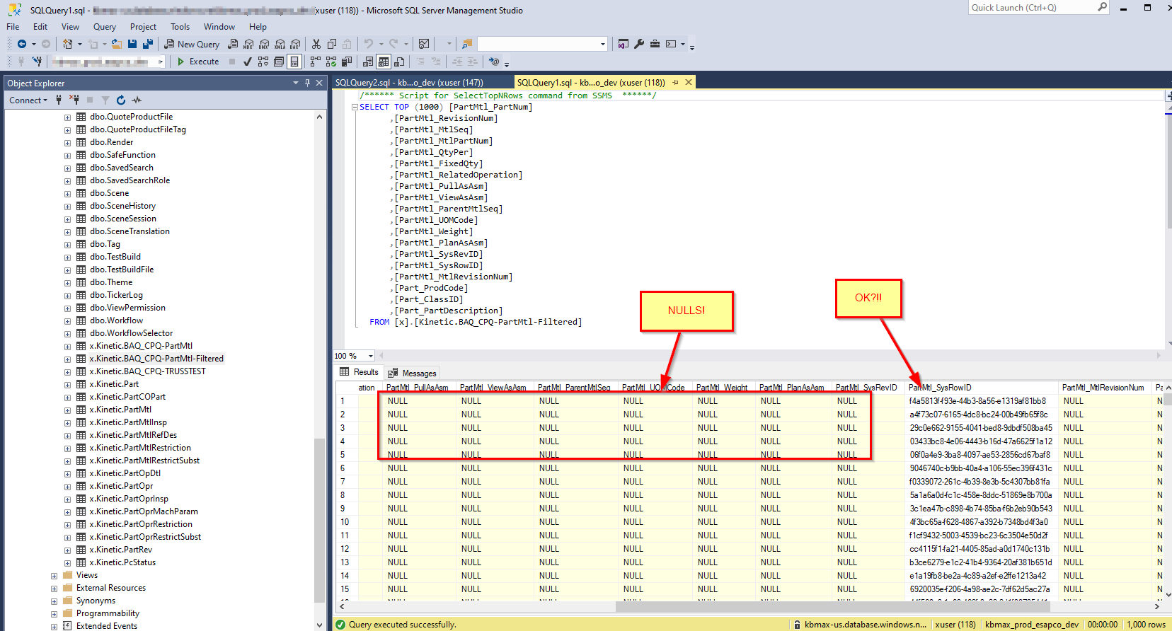 Then I filtered the results using a few specific Product Groups (joined to the Part table), which got the sync down to 65k rows. This time the system monitor shows complete. Unfortunately the data in the CPQ SQL table is all nulls, except for the SysRow column.