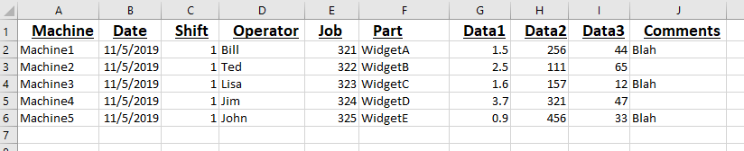 I’m curious if anyone has some advice on this. I have some users that have a need to record data about a number of machines for every shift, every day. I had already created them an entry program (storing the data in UD10) but the idea of having to select the machine from a dropdown, enter data, and update each individual machine was evidently too slow for them.What they are used to is something along these lines: