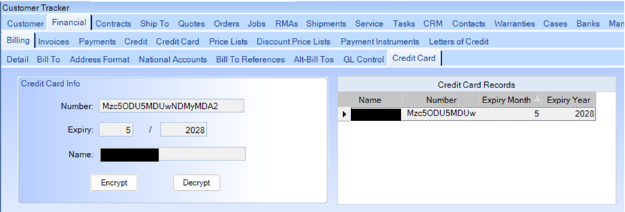 In classic we have a customization that added a TAB to a 2nd Customer Maintenance screen available only to Finance Supervisor and AR Admin. This TAB is a UD Table where AR can enter the information and the click ‘Encrypt’ to hide the data, ‘Decrypt’ when they need to make a payment.