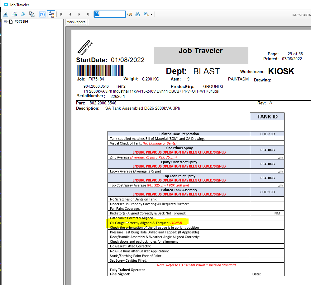 We modified Job Traveler Report as below (Print Preview screen) highlighted is the change we did.