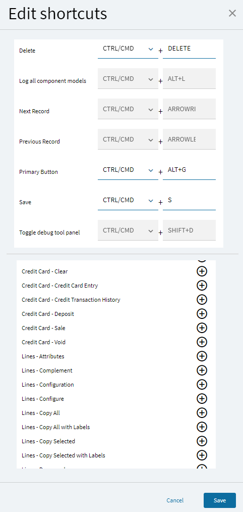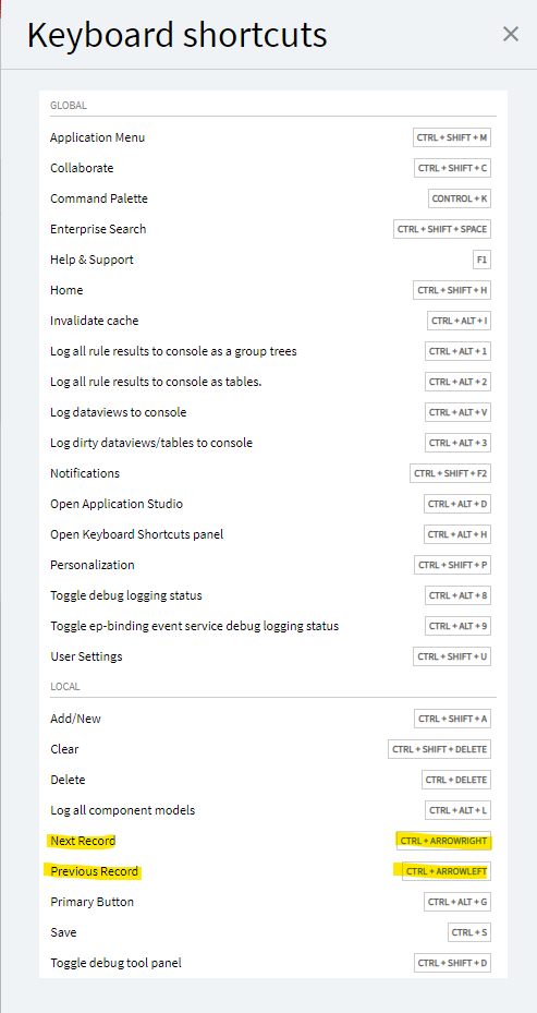If you hit CTRL+ALT+H, it opens up the keyboard shortcuts… SOME of them are editable, though, it appears Next & Previous record shortcuts are greyed out and cannot be changed.