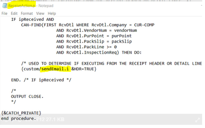 We have a custom .p file that references the sendEmail.i file. If we update the sendEmail.i file, when we recompile the .p file, does it incorporate the sendEmail.i file also when promoting it to a Test environment? I’m not familiar with how the .i file gets compiled together with the customization. Why doesn’t the sendEmail.i file also get promoted along with the .r recompiled file?
