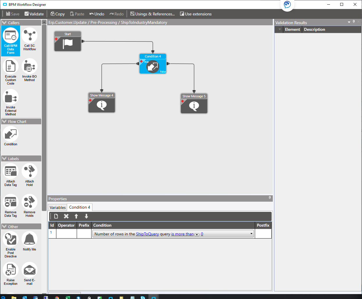 Im working on a BPM where the customer group needs to be a value and a ud field value on the customer ship to table cannot be blank. if I run the bpm with one or the other criteria it works. But cant seem to get the bpm to follow the true side of the condition to fire the required message. I did message box on both sides and it show the group code is blank. and automatically fails. Not sure if can do it this way or not. Any Suggestions. Let me know if this is confusing.