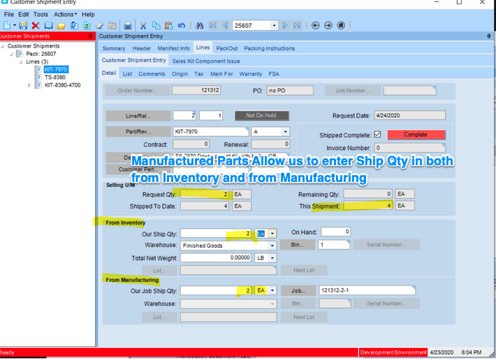If we are shipping a part configured as a Sales Kit we’ve observed in Customer Shipment entry the user can only enter Our Ship Qty from Inventory. Although for a manufactured part we see that a user can enter Our Ship Qty from both Inventory and from Manufacturing. We’re seeing issues where Our Ship Qty is populated for both Inventory and Manufacturing. My best guess is this is a user training problem(entering the wrong data in the wrong field), but wondering if it’s possible to setup a manufactured part to work like a sales kit, that is only allow them to enter Our Ship Qty from Manufacturing?