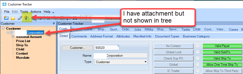 I have an attachment on my customer record, and can see it in Customer entry tree structure. However, in customer tracker, per below, I can only see it via the little paperclip asterisk icon. Many of our users are more experienced with seeing attachments in the tree. The dcoument type is setup for “expose in tree”.