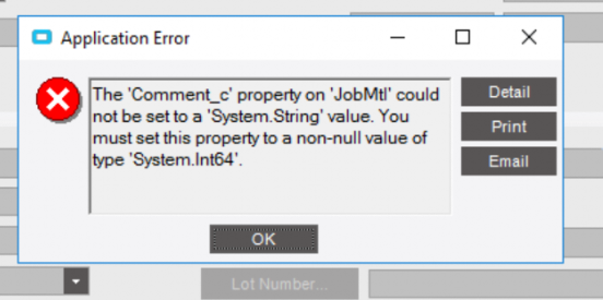 Can you double check in UD Columns Maintenance on Table JobMtl_UD what you have. Worst case I would regen again. Because its enough for the Comment_c to exist in UD Columns Maintenance with wrong type or default value, despite you not using it, it still intializes the DataTable on the UI behind scenes.