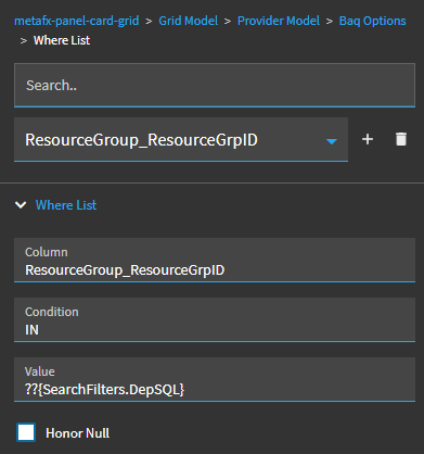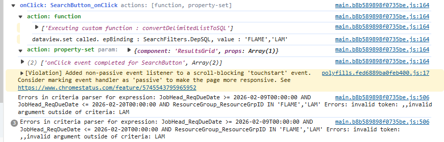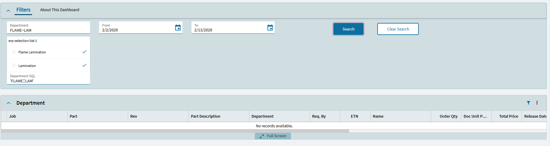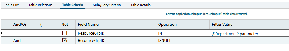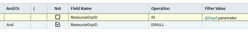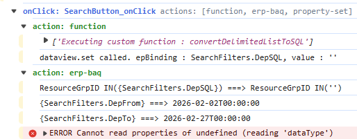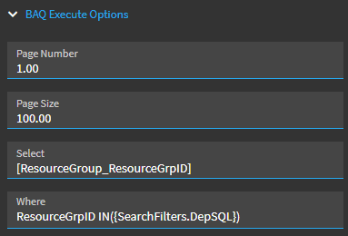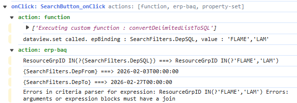 With this, selecting multiple items on the list gives me everything that the original BAQ would get, including things outside the date range. Selecting nothing will get me all resource groups within the date range. Selecting one will show nothing in the grid.