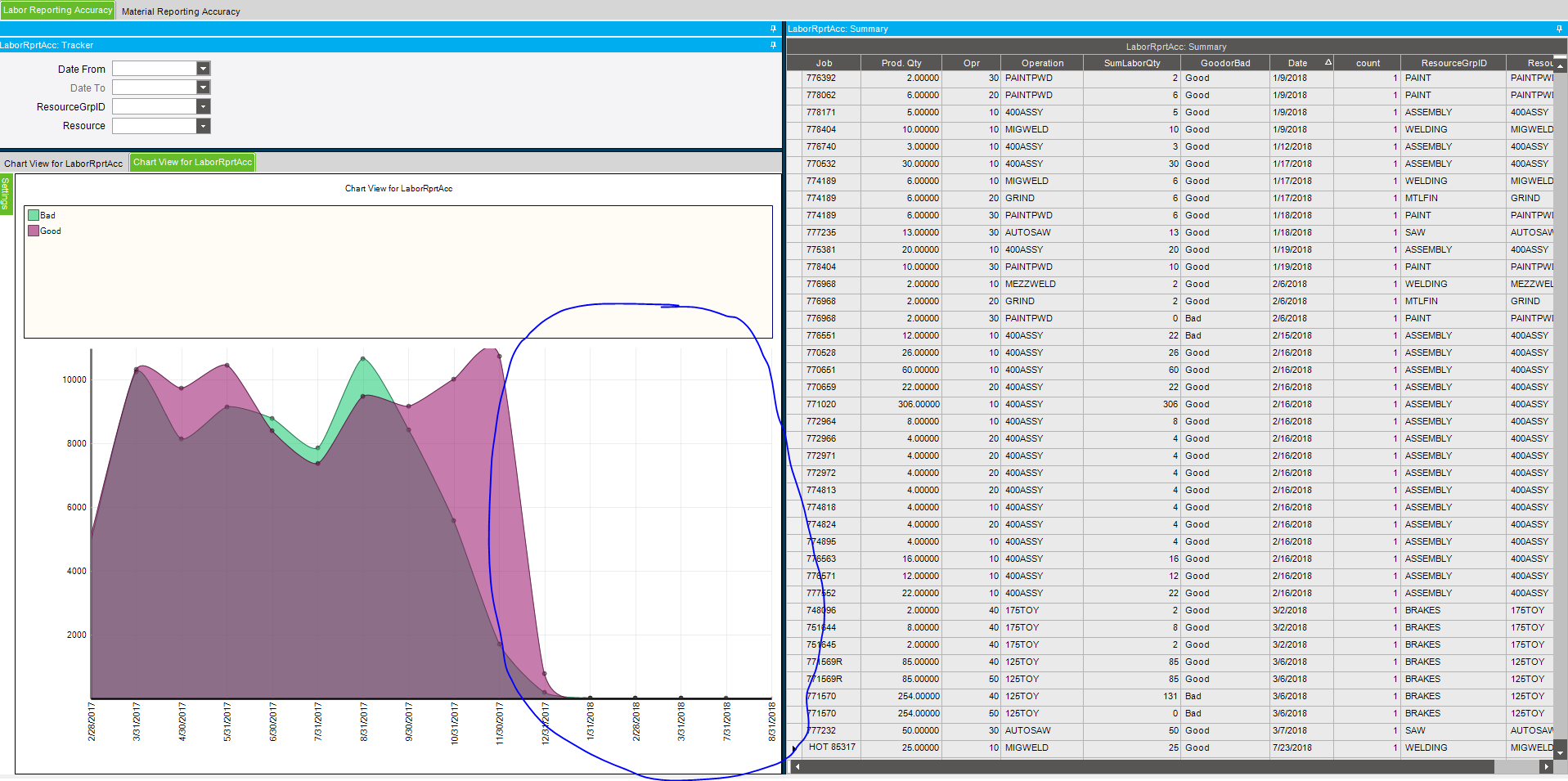 So I created a Dashboard that has two Queries, that are going to be used to track our accuracy in our labor reporting and our receiving MFG-STK. Everything appears to work fine until i do a line chart that shows i have no data after 1-31-2018. See Image
