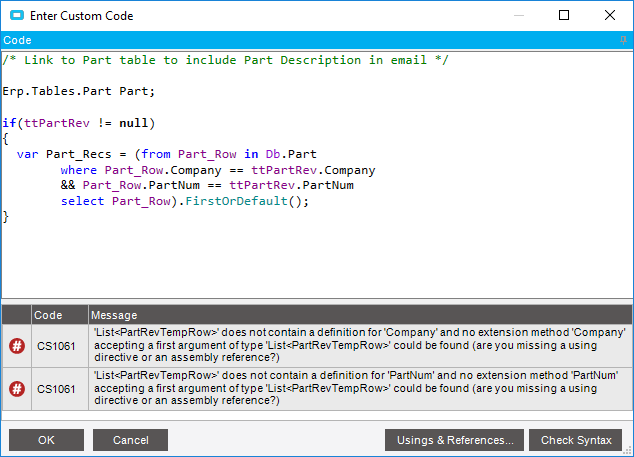 I want to include the Part Description on the email and this is not available from the PartRev table - do I need to use the āExecute Custom Codeā for this?
