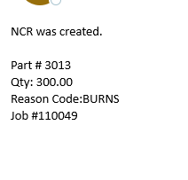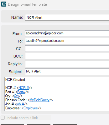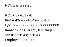 Thank you I just created the PartTran I am having a hard time getting the NCR # (I tried a couple fields and still not showing) and Employee name/Id (I tried entry person and EmpID) to go onto the email. Neither of them are showing up