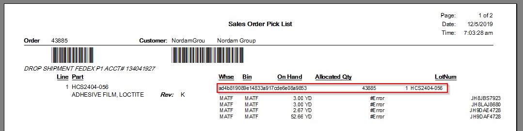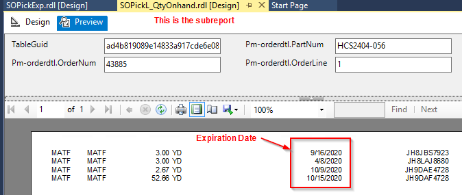 I am trying to modify the SO Pick List by adding a column to the SOPickL_QtyOnhand subreport. In the subreport dataset I have linked in the PartLot table to pull in the ExpirationDate. When I supply the necessary parameters for the subreport and preview it, the ExpirationDate is displayed as expected; however, when the main rdl is previewed (SOPickL.rdl) it shows all the data in each column correctly, except for the ExpirationDate column. There is shows #error. Since this is a subreport, there is no formatting on the SOPickL.rdl, so I am perplexed.