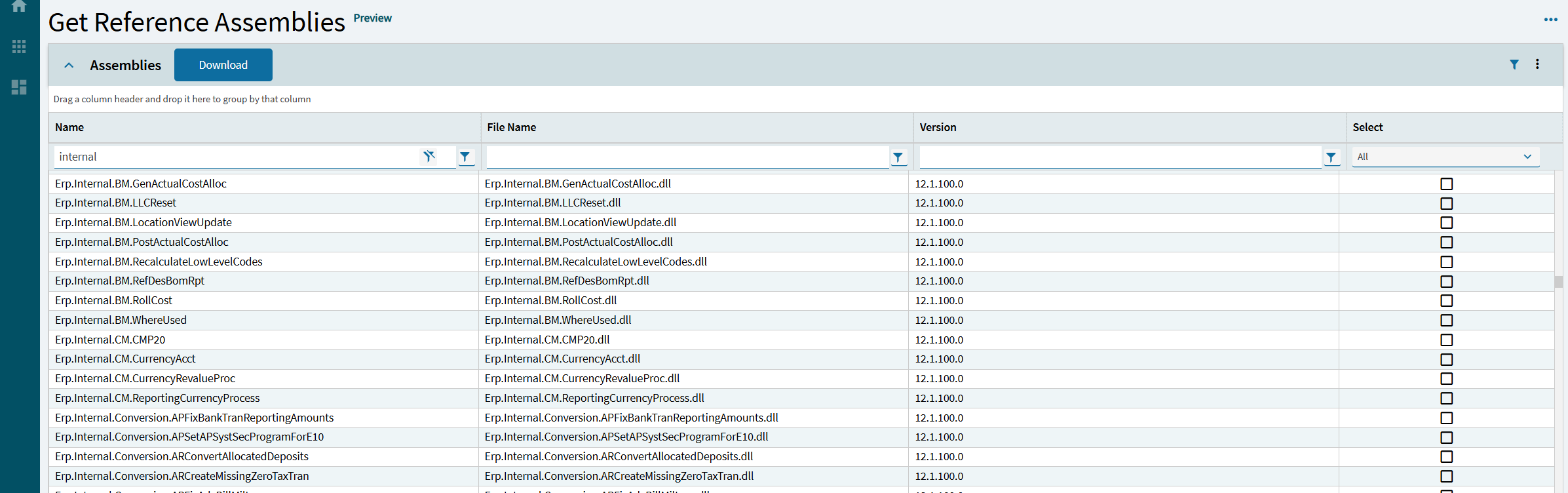 The list of Assemblies available can be had by querying the Ice.BO.BpMethod.GetAvailableReferences