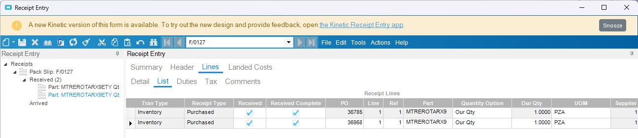 When tracking purchase orders, 36785 shows both received lines from orders 36785 and 36958. However, when checking in the Order Tracker, PO 36958 does not show reception details.