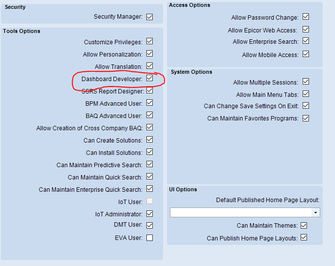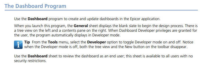 I am new to Epicor and its systems. The lead for Epicor here has provided me with full access to Epicor but I am unable to enter Developer mode to start creating dashboards. She claims she gave me full access but something must be missing.