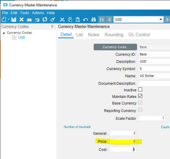 Our implementation has the decimals as 2/5/5 for general/price/cost; I assume thatās standard out of the box. And I am hearing that price has to change to 2 decimals for this to work.