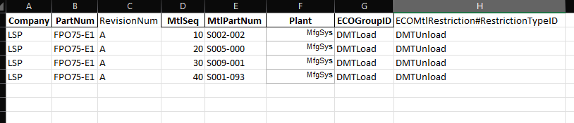 Company PartNum RevisionNum MtlSeq MtlPartNum Plant ECOGroupID