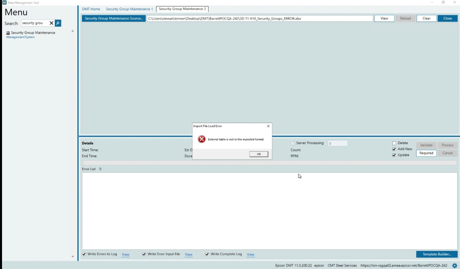 I’m trying to gauge how much of an issue this is generally. I work with DMT a lot, I can run a file, then try to run exactly the same one again but get an error message saying, “DMT - External table is not in the expected format”. Workaround is to copy and paste the contents into a different xlsx file, very frustrating.