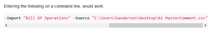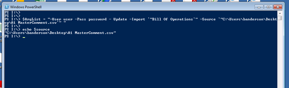 $ArgList = "-User user -Pass password - Update -Import `"Bill Of Operations`" -Source `"C:\Users\banderson\Desktop\A1 MasterComment.csv`" "