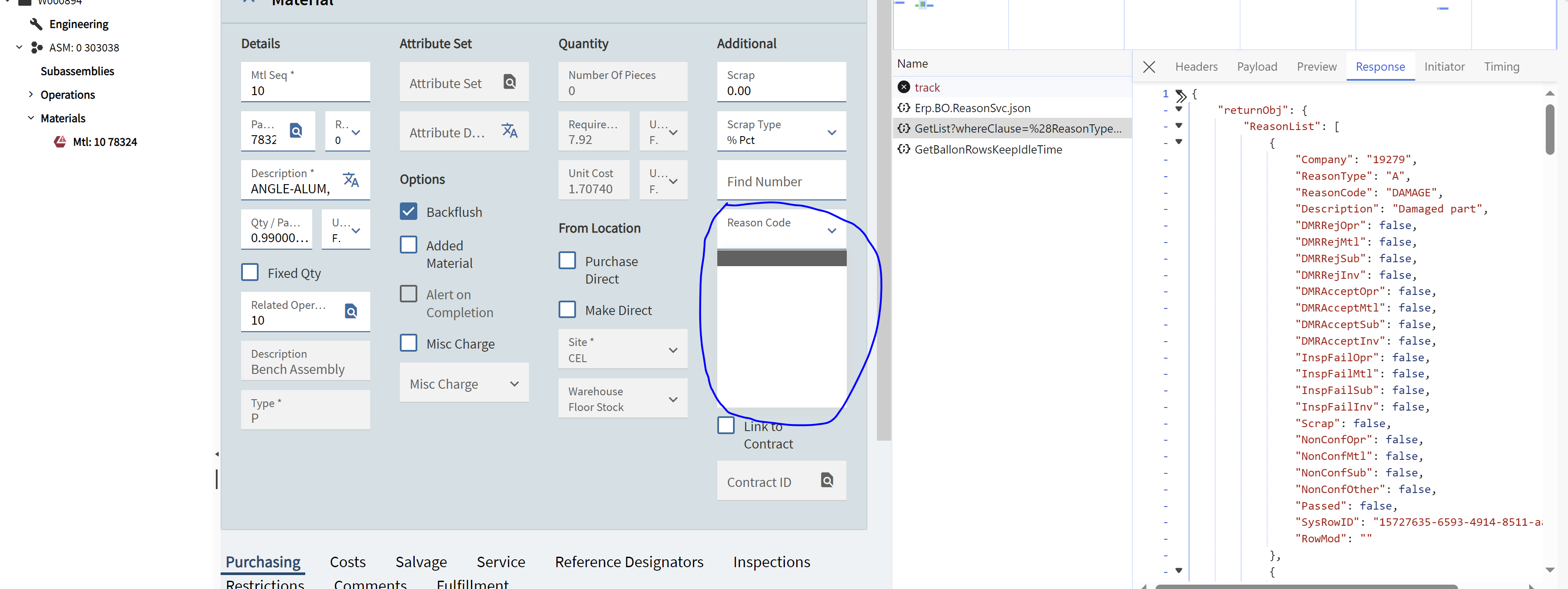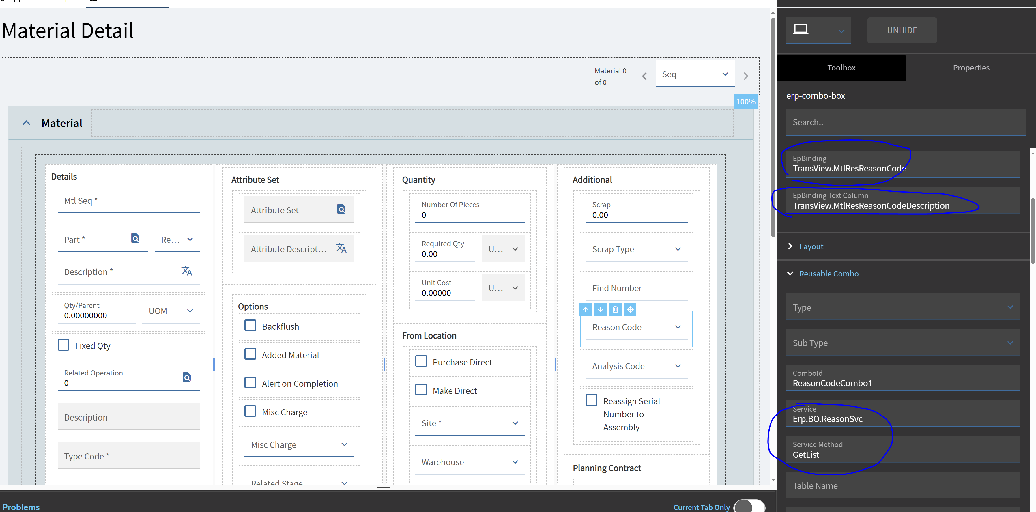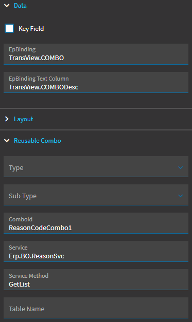 I added a compo box, which is populated from the Erp.BO.ReasonSvc service’s GetList method: