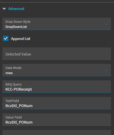 I have a dropdown list that populates po’s correctly. But I also want to show the line and release for that PO. I’m guessing it needs to go in the Text field. I am getting the line and release for the PO in the BAQ.