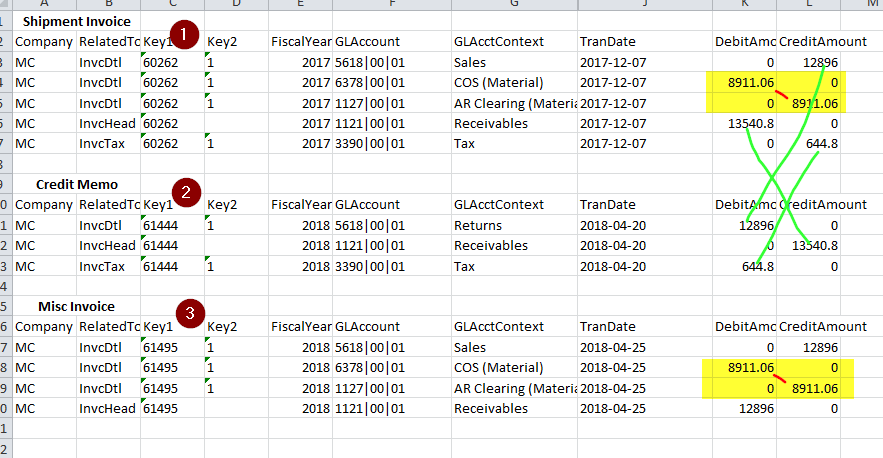 (3) in the subsequent Re-invoicing (a Misc invoice), and the AR Clearing to COGS shows up again.