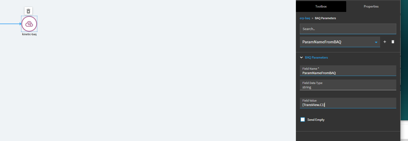 Within that event, you can call your BAQ with the kinetic-baq widget and specify the value for the parameter here: