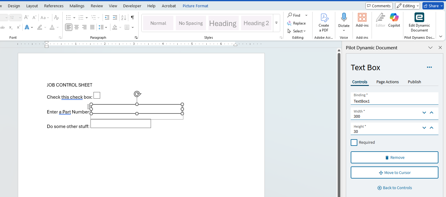 I can see where it could be nice to have the operator submit information about the op they are working. My Dynamic Document is not bound to any fields. I have setup a basic template like this: