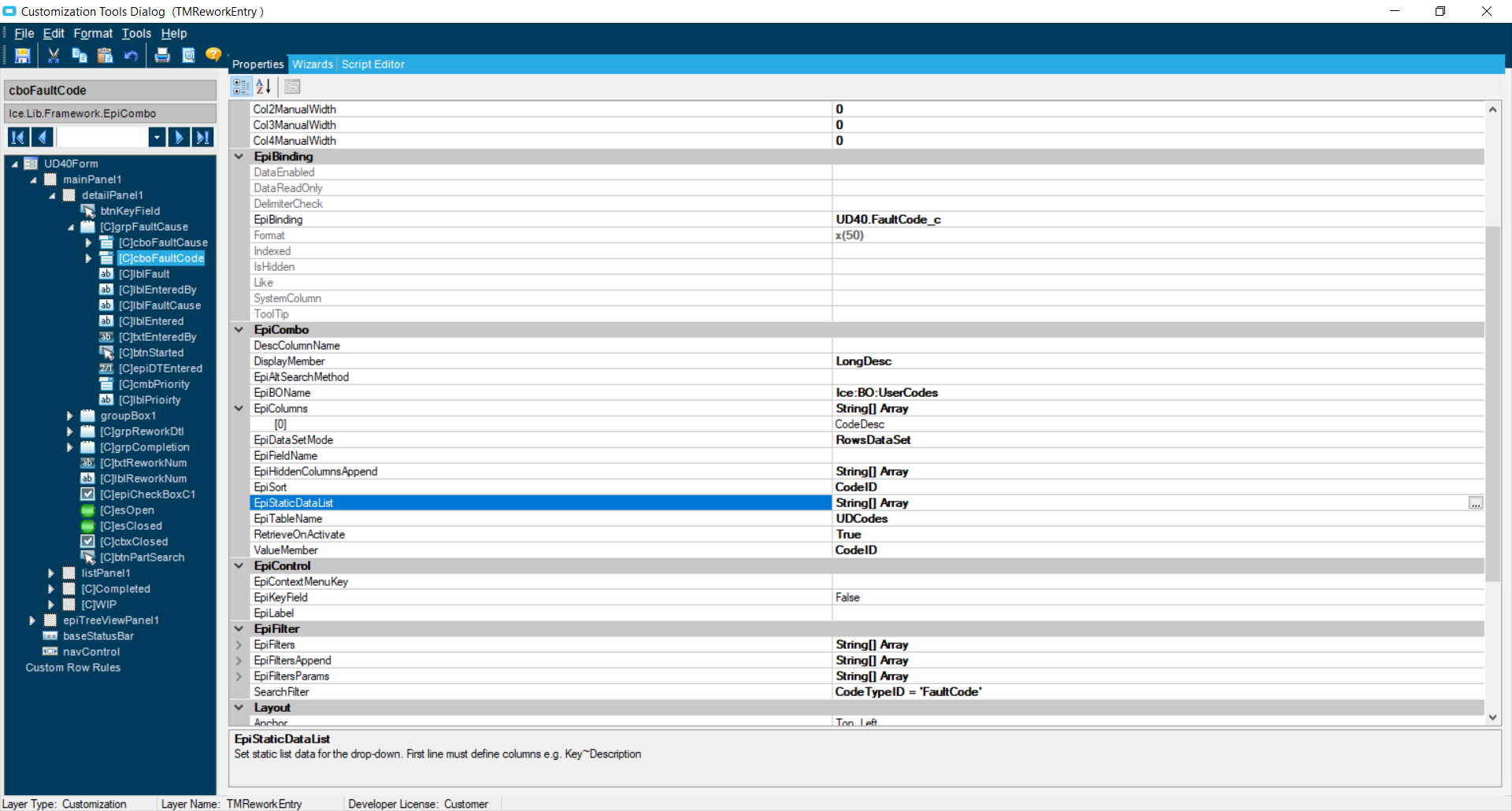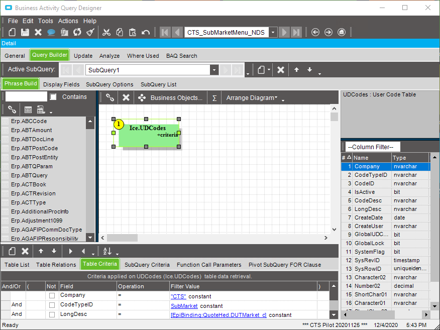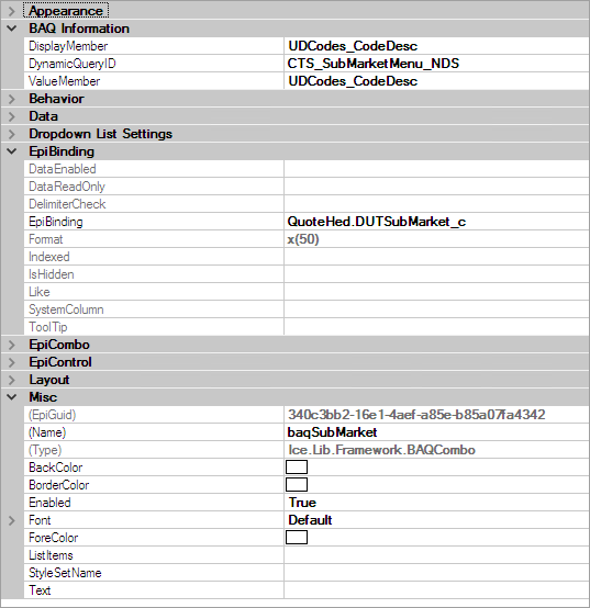 For my example, we have a UD field named DUTMarket_c and a related UD field named DUTSubMarket_c that we wanted to change our options dynamically with the selection of the Market. Instead of using an epiCombo Box, and adding C# code, I used a BAQCombo Box. This allowed me to write a BAQ querying our UDCodes and then using another field as a variable to dynamically change the list as the value of another field changed.