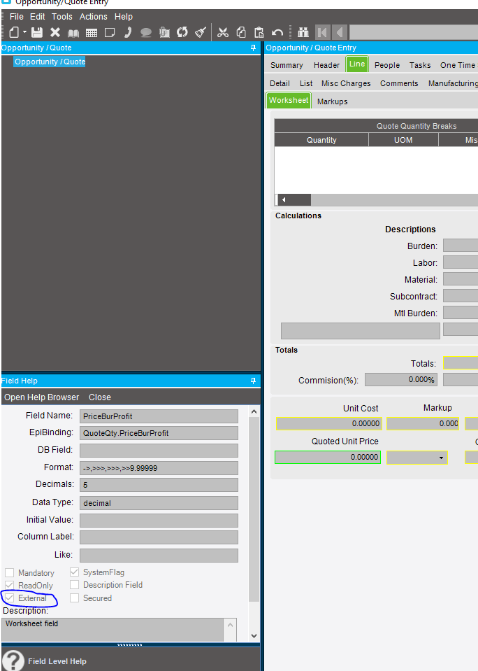 Here is what I meant by External field (see picture). I dont know if it is a field that is either calculated in real time or is saved in another table, but i couldn’t find it in the database. In this case it is supposed to be in the QuoteQty table but there are no fields called PriceBurProfit.