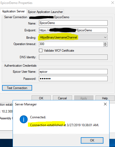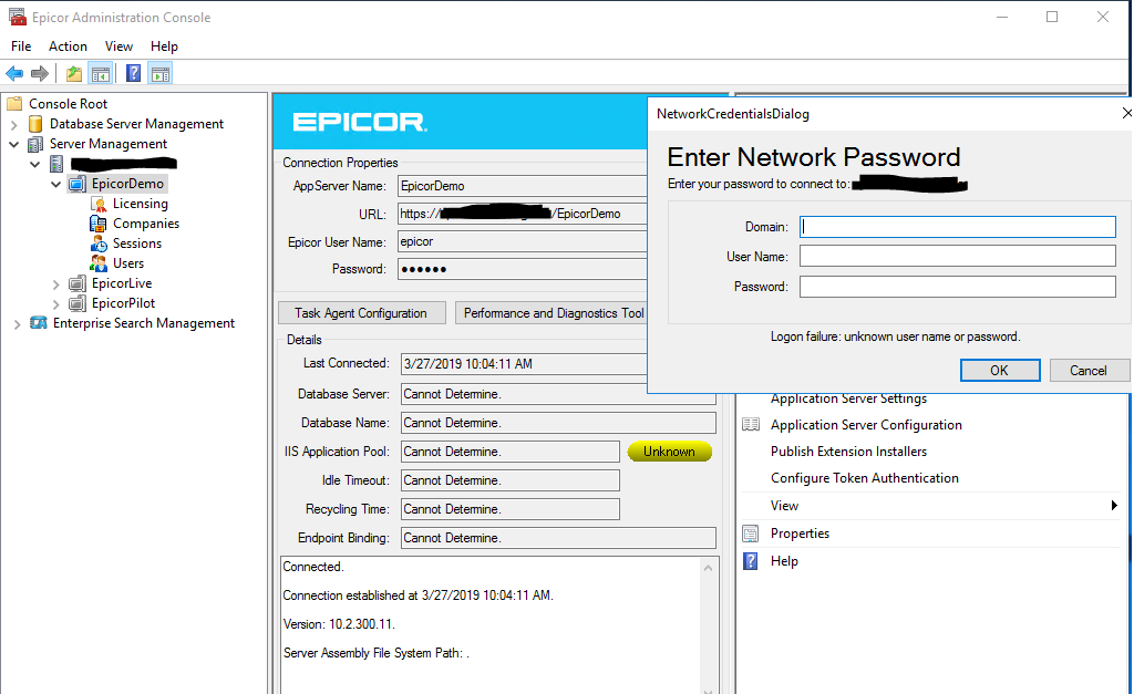I’m currently having an issue with one of our Epicor installations, but it seems to only affect the Epicor Administration Console (EAC). It began to appear after we changed the SSL Certificate from a self-signed certificate created on the Epicor server with one provided by an official authority, installed on the server by the customer itself. As you can see, in the screenshot below, the App Server environment connects, but its not able to determine the environment info. I’m able to expand and access lic, companies, users, etc. without problem, except for pop up messages requesting Network Credentials.
