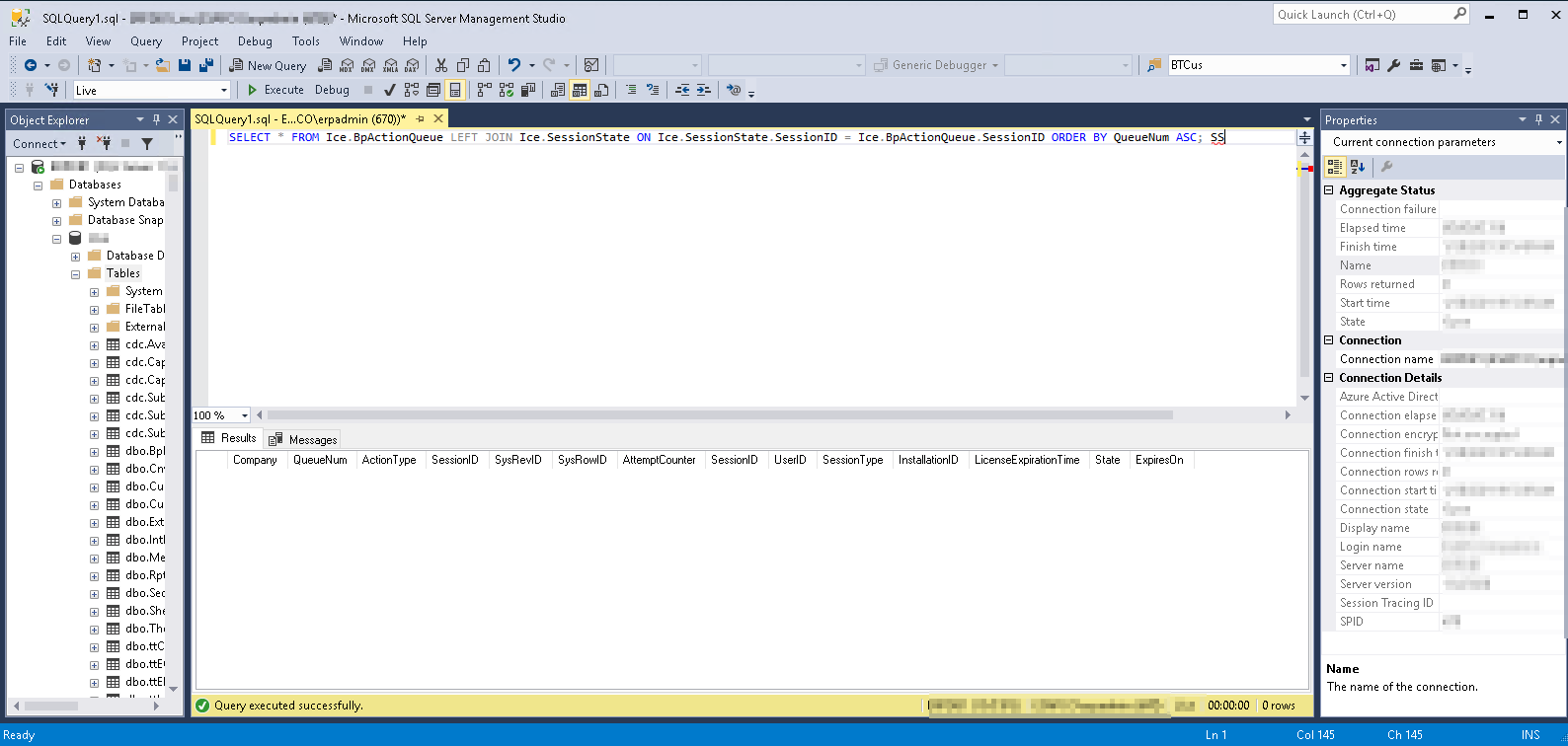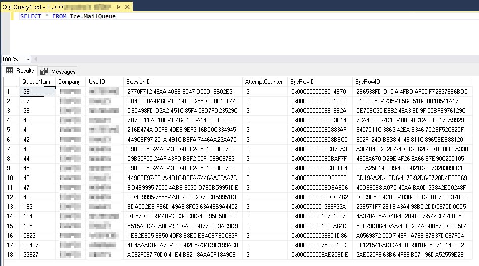 I executed @hkeric.wci’s SQL script, but there were no records when I executed the query in SSMS. Then I ran it for just Ice.MailQueue, and did get 18 records (some ancient based on a user that hasn’t been here for 3 years, others I don’t know): BPM Emails not working all of a sudden