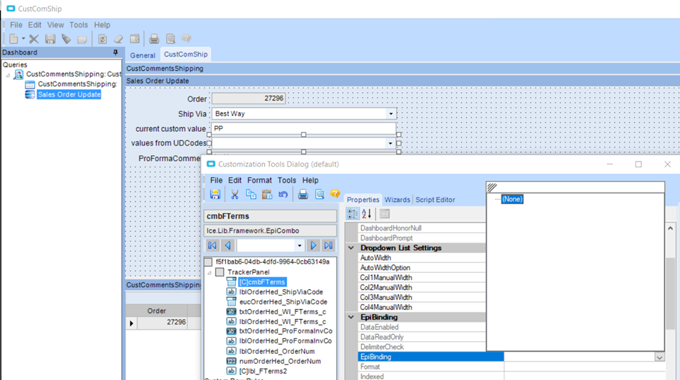When I created the tracker view, it put the Ship Via in a combox and populated the list with all possible values, defaulting to the current value on that sales order. However, for my UD field beneath that, it only populated the code from UDCodes, not the description and it’s not in a combobox with all possible values. That’s why I tried to create my own combobox to mimic this. I was able to get all possible values to show in the list, but I don’t see a way to default the current value from the sales order since the EpiBinding property has no available fields.