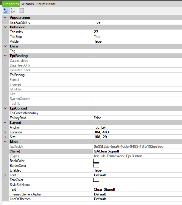 I think you then mean to use the Event Wizard to do a control type filter on the Epibutton of my custom control (QAClearSignoff in my case) and the available control event of click to run the code you listed above setting âCheckBox01â = true.
