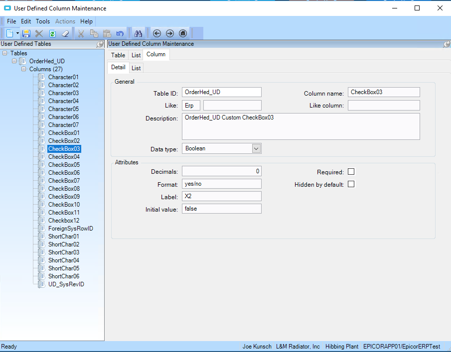 I am trying to bind a checkbox that I added onto the Sales Order Entry screen called production hold. Not sure what I am missing here, but when I check it, it doesn’t write to the database when I query that table and field. I have not messed with CheckBoxes yet. I have it tied to OrderHed_UD.CheckBox03 right now, but like I said, it just isn’t working.