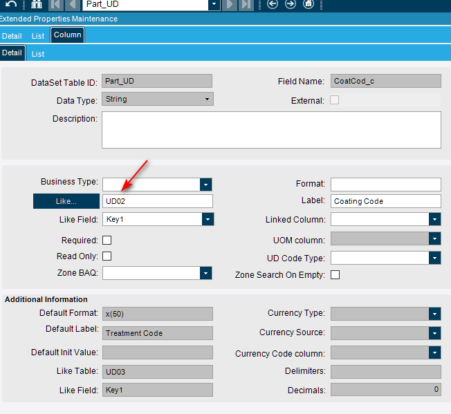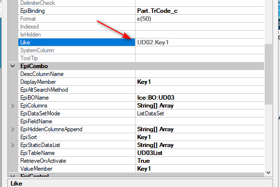 I added another UD field to the table, making sure to set the “Like” appropriately, regenerated,and replaced the field in the customization. Same result. The “Like” field in the entry screen properties defaults to the wrong UD table and cannot be updated.