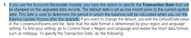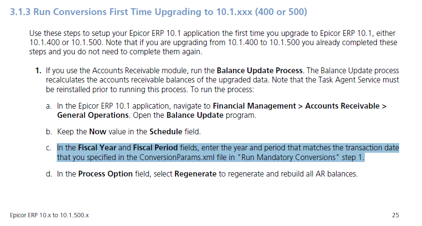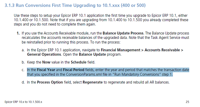 Following the upgrade document (Epicor10_ReleaseUpgradeGuide_10xto101500x.pdf) and in section 3.1.3 it says we need to run the Balance Update Process if we use the AR module, which we do. However, one of the parameters the process asks for is a Fiscal Year / Period. Here is the relevant part in the manual: