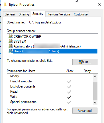 Ok I gave the group full control to the local Epicor folder on the RDSApp Server…still same error. Is it on the RDS App Server or where it is being publlished from. I don’t know this well so not sure I am explaining it well. Everything is controlled on another server…