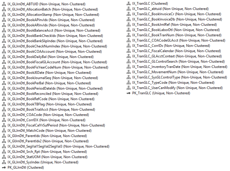 Looking at the indexes themselves we have 31 non clustered indexes on Erp.GLJrnDtl and another 16 non clustered indexes on Erp.TranGLC. Are all of these stock Epicor indexes or were these added by us?