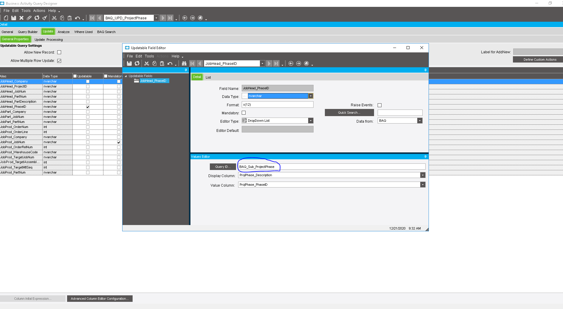 Need Assistance to Pass Parameter ‘ProjectId’ to baq BAQ_Sub_ProjectPhase in a updatable parent baq for dropdown list source as custom baq , since i want to filter phase based on the project id