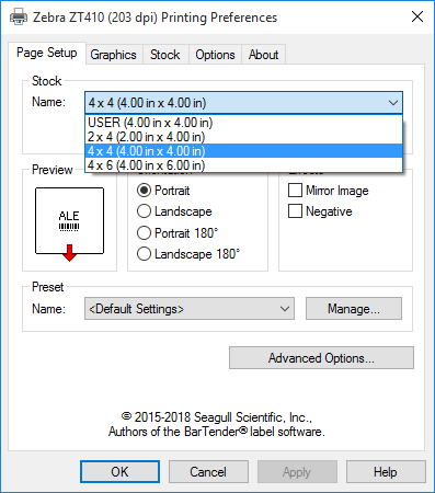 However when you reach the Print Dialog (where you select your Printer) right click there on the ZT410 and go to Properties there will be a setting to set a User Defined Size and you might even have to set it to the Default Size Preset. Basically set all those Properties to 4x4 and it should Print much better.