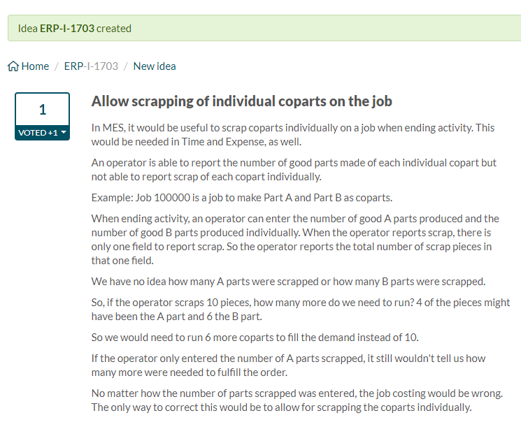 I just entered my first New Idea into the Epicor Ideas system. I would appreciate as many votes as we can get for it because it is a sore spot for many companies who use coparts:
