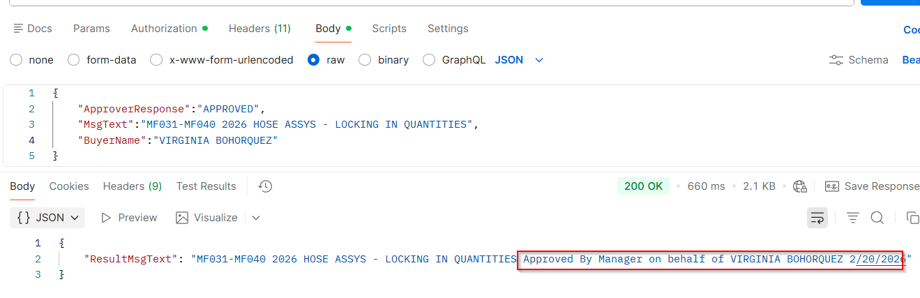 ResultMsgText = prefix + "Approved By " + user + " on behalf of " + BuyerName + " " + today;