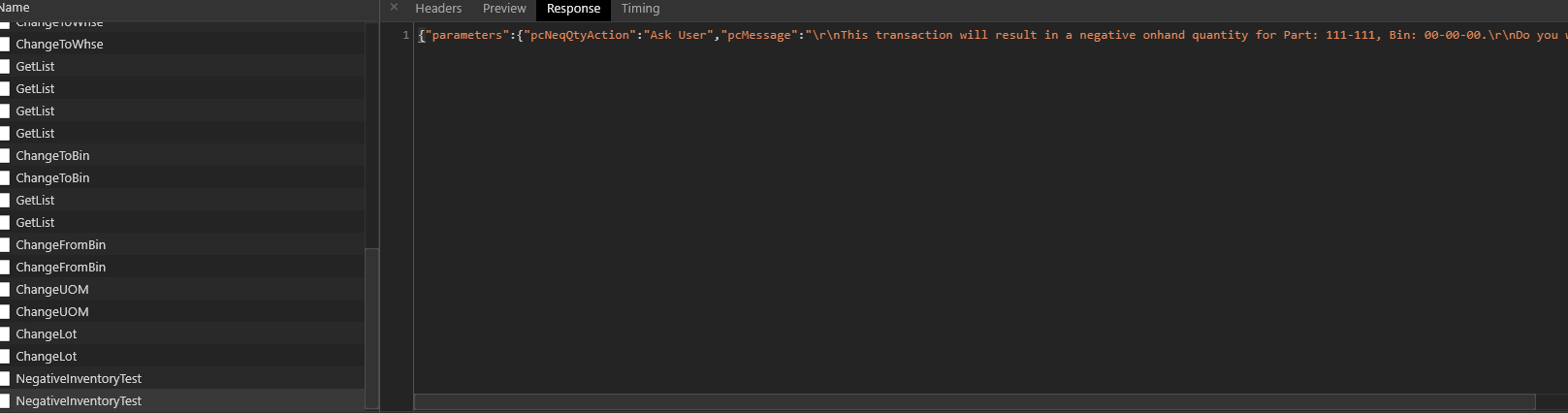 NegativeBinTest will take the following and if the result of the transfer is going to be a negative it will respond with a warning message. If it will not result in a negative inventory it will just be empty.